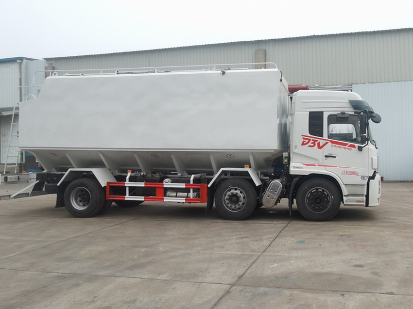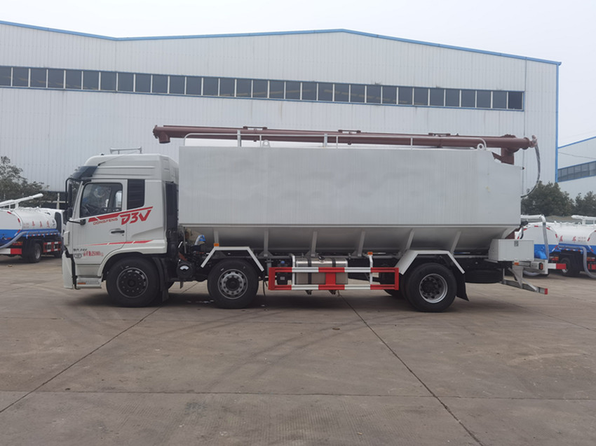 散裝飼料運輸車,散裝飼料車的飼料罐架設(shè)在卡車的底盤上,罐頂開有進料口.頂部的一根螺旋輸送卸料管(俗稱卸料絞龍)則可自由回轉(zhuǎn)和抬升,抬升的仰角可達60度。運輸時,頂部的螺旋管平臥在罐頂;卸料時則抬起,使管端的出料口與畜禽飼養(yǎng)場貯料罐頂部的進料門相接,駕駛室內(nèi)裝有操縱裝置(操縱裝置也可裝置在罐體尾部),卸料時通過車底的動力輸出軸和減速器來驅(qū)動螺旋,以完成卸料。