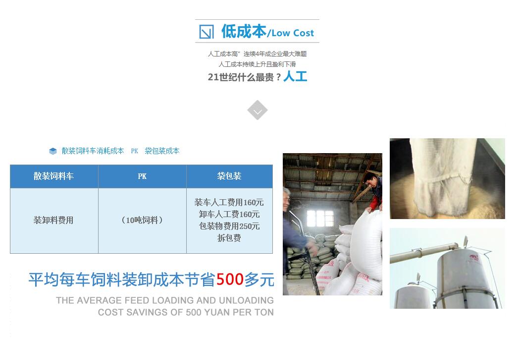 1 經(jīng)濟(jì)效益、勞動(dòng)時(shí)間等對(duì)比 項(xiàng)目 袋包裝 飼料罐 裝卸費(fèi)用(1噸飼料) 18元(人工) 2元(電耗) 包裝袋費(fèi)用(1噸飼料) 20元 0元 裝車(chē)時(shí)間(10噸飼料) 60分鐘 20分鐘 卸車(chē)時(shí)間(10噸飼料) 60分鐘 30分鐘 從上表中可以直觀的看出:1.在裝卸費(fèi)用上,散裝運(yùn)輸比袋包裝運(yùn)輸要節(jié)約16元/噸。2.在包裝費(fèi)用上,散裝運(yùn)輸比袋包裝運(yùn)輸要節(jié)約20元/噸。3.在裝卸時(shí)間上,散裝運(yùn)輸比袋包裝運(yùn)輸要節(jié)約70分鐘。通過(guò)以上統(tǒng)計(jì)分析發(fā)現(xiàn),散裝飼料運(yùn)輸車(chē)經(jīng)濟(jì)效益非常明顯。